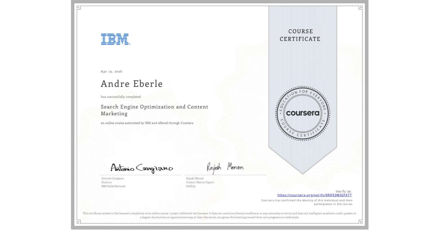Ergänzend zu den umfassenderen Zertifikaten wurden weitere praxisnahe Online-Kurse über Coursera erfolgreich abgeschlossen. Diese Kurse vertiefen insbesondere die Kompetenzfelder WordPress, SEO, Content-Erstellung und KI-gestützte Content-Prozesse.